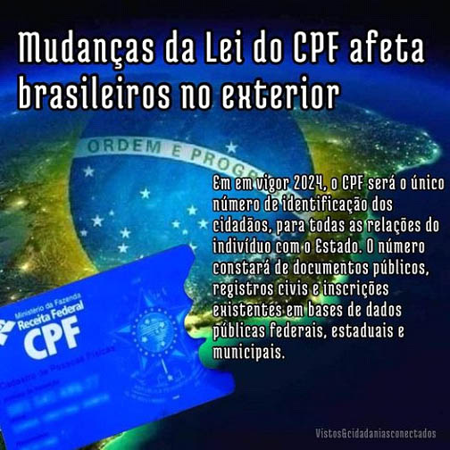 Com a lei 14.534, vigor em 2024, o CPF será o único número de identificação dos cidadãos, para todas as relações do indivíduo com o Estado. O número constará de documentos públicos, registros civis e inscrições existentes em bases de dados públicas federais, estaduais e municipais. Para fazer qualquer solicitação de serviço público será necessário informar o CPF.