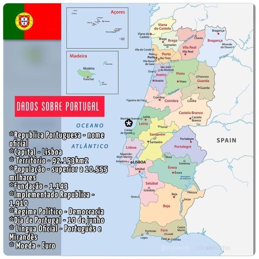 Território – Área de 92.152 Km2 dividida por 18 distritos no Continente e 2 Regiões Autónomas (Açores e Madeira) – 1143